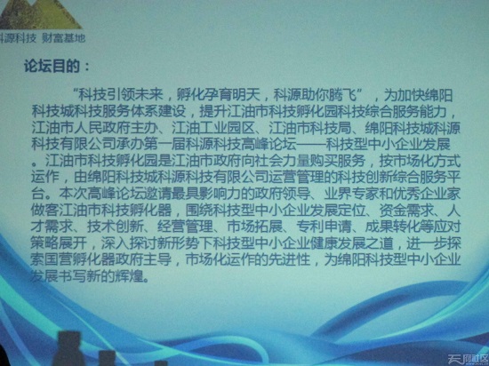 座落在江油市工業園區的江油巿科技孵化園大樓于今年9月15日投入使用,共有5200平方米,90個房間。目前已有33家科技型中小企業入駐,另有15家企業正準備入駐,共搜集整理科技項目達668個。該孵化園由綿陽科技城科源科技有限公司運營管理,是省內少有,綿陽區、市、縣首家政府向社會力量購買服務,國營孵化器市場化運作的創新型科技綜合服務平臺。該孵化園在運營方式上,實行管理創新、服務創新、理念創新和一站式服務的最新模式。高峰論壇邀請了本市最具影響力的政府領導、業界專家和優秀企業家做客論壇。