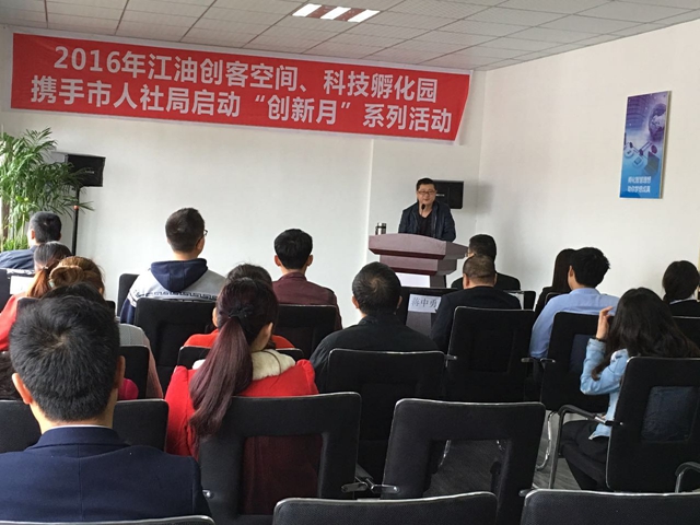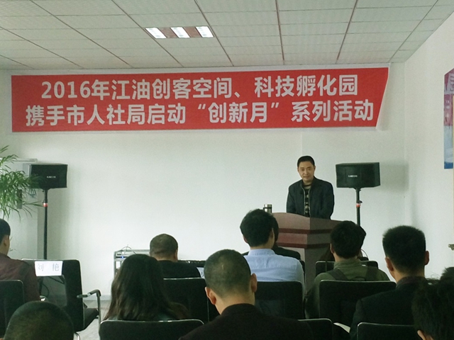 2016年4月8日(ri),江(jiang)油市(shi)創(chuang)客空(kong)間(jian)和(he)攜手市(shi)人(ren)力資源(yuan)和(he)社(she)會保(bao)障局舉辦“創(chuang)新月”政(zheng)策(ce)培訓(xun)會,參(can)加培訓(xun)會的有市(shi)人(ren)社(she)局人(ren)才中心主任蒲益、副主任郭建華、股長蔣紹富、股長劉光勇以及(ji)創(chuang)客空(kong)間(jian)和(he)的入孵企業(ye),培訓(xun)會由創(chuang)客空(kong)間(jian)經理鮮曉波主持。