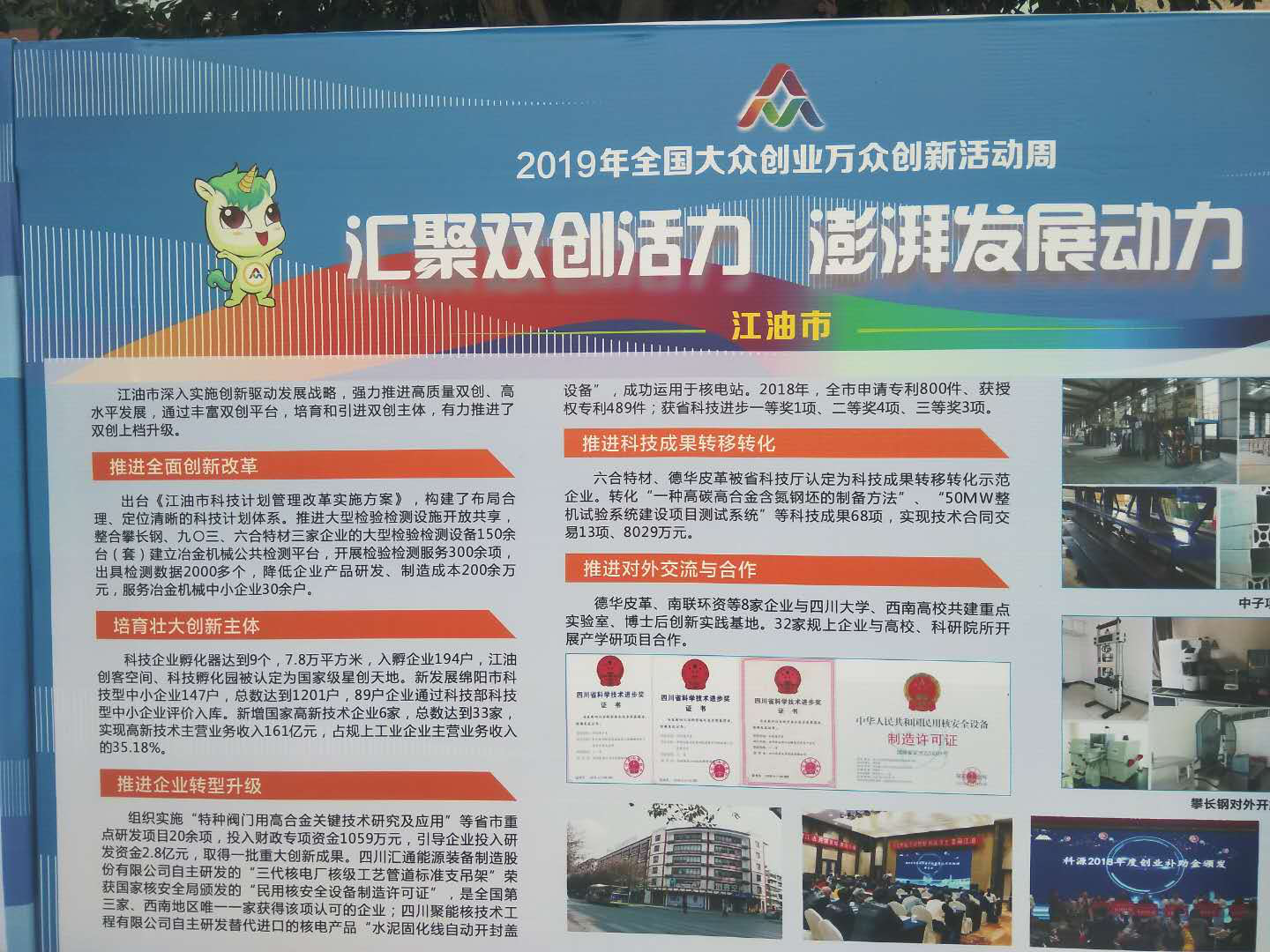 本次活動還對綿陽雙創工作開展情況進行了展覽展示,科源科技作為本土知名的孵化平臺,在綿陽雙創工作推進上畫下了濃墨重彩,雙創周成果展示上多個篇幅推出了科源旗下的、江油、、的創新創業成果。